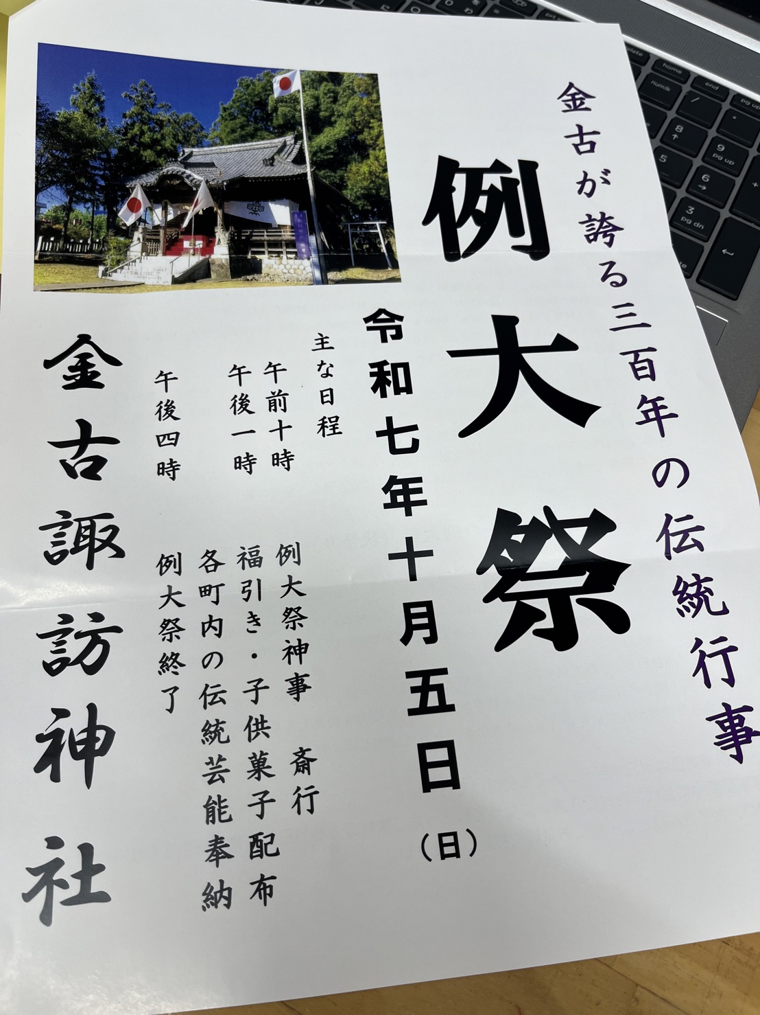 今週日曜日に金古諏訪神社の例大祭が催されます。 提灯が飾られるとお祭りならではの賑やかさを感じますね。 福引やお菓子の配布などもあるそうなので、 お時間ある方は行かれてみてください。