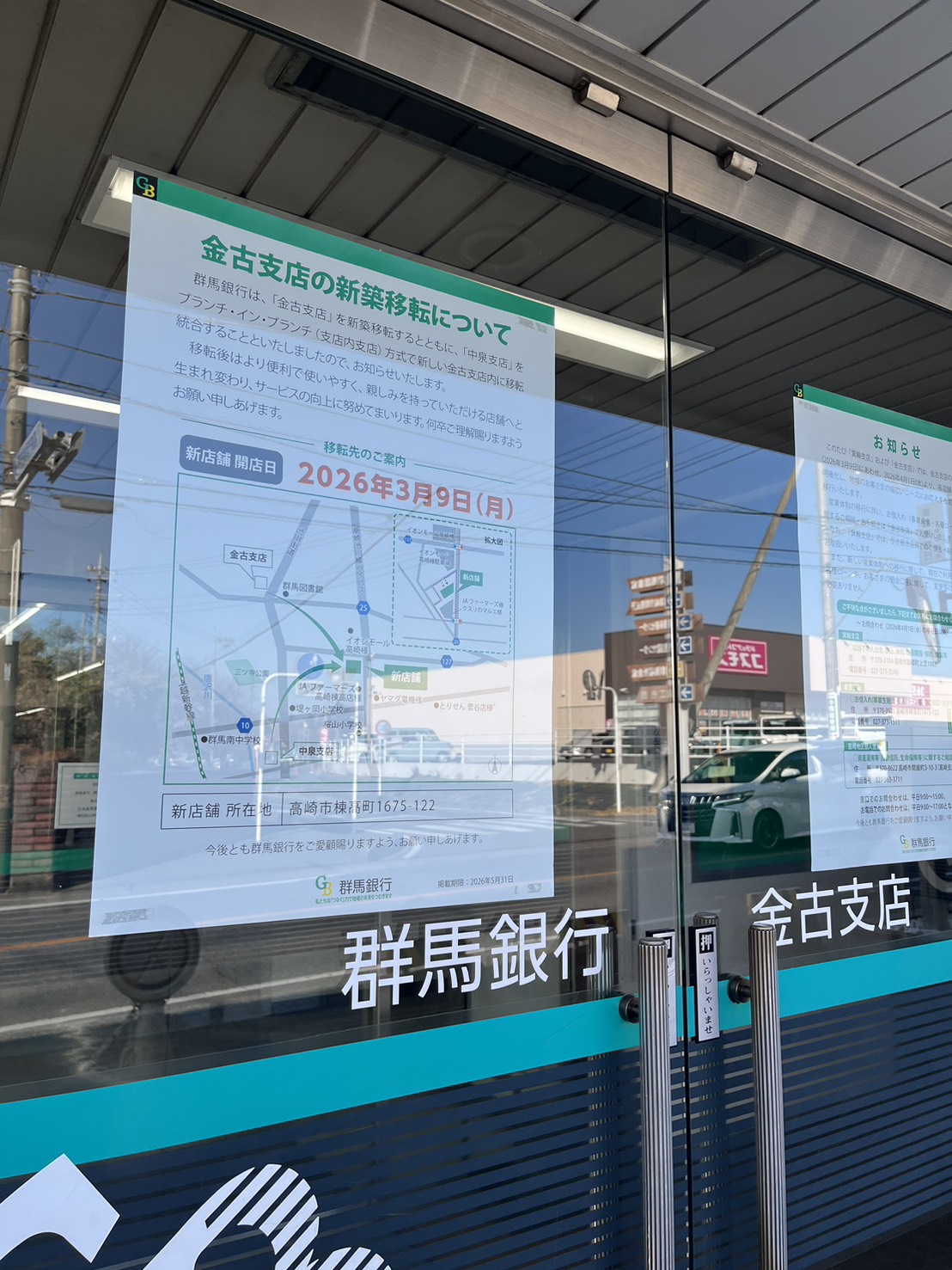 移転予定の群馬銀行 金古支店ですが、 3/9から新店舗での営業を開始するそうですね。 中泉支店と統合して棟高町に新築される予定ですが、 今の金古支店は事務所から近く、裏道から行けるのが便利だったので 遠くなるのか~~~~ […]