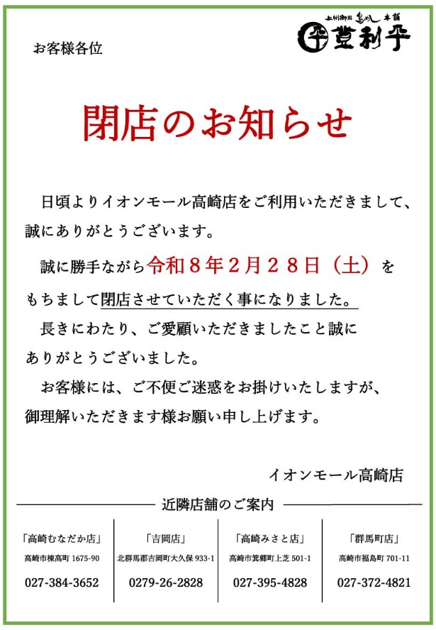 登利平 イオンモール高崎店が2月末で閉店するそうです。 去年、前橋住吉店がなくなったばかりだったのに・・・。 お持ち帰りのお弁当ももちろん美味しいですが、お食事処もよく利用していたので残念です。 杜丸エリアに残るは、 ・ […]